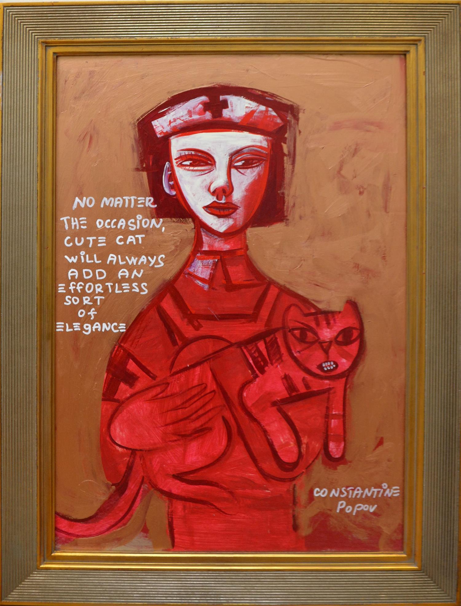 CONSTANTINE POPOV, NO MATTER THE OCCASION, CUTE CAT WILL ALWAYS ADD AN EFFORTLESS SORT OF ELEGANCE, ACRYLIC ON BOARD, 88 X 58.5CM, FRAME SIZE: 107.5 X 77.5CM, LEONARD JOEL DELIVERY SIZE: LARGE