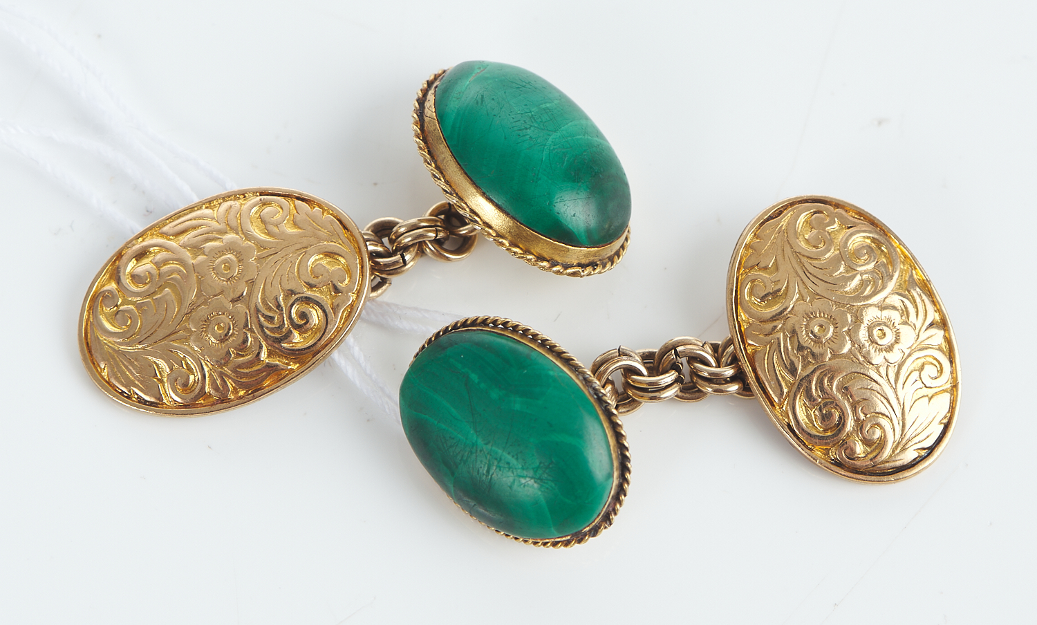 A PAIR OF MALACHITE CUFFLINKS IN GOLD LINING AND 9CT GOLD