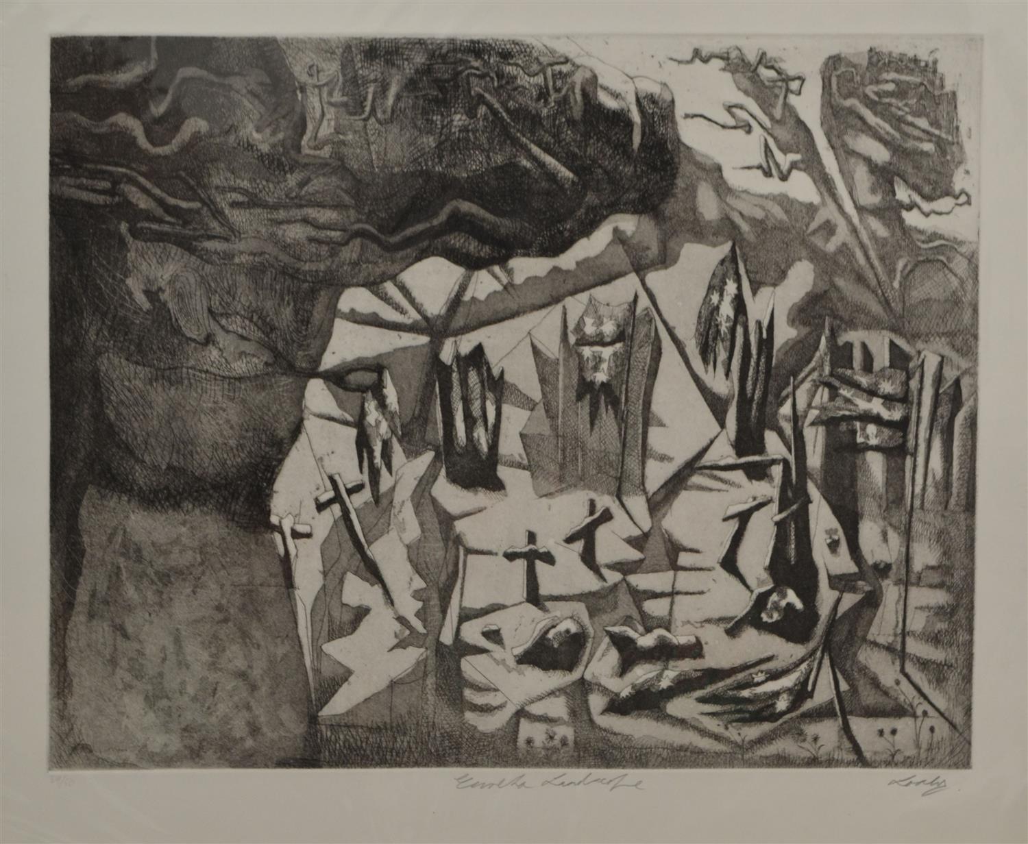 KEITH LOOBY, EUREKA LANDSCAPE, ETCHING 39/50, 56 X 70CM SHEET SIZE. CONDITION: THIS WORK IS IN VERY GOOD CONDITION, UNFRAMED BUT BACKED AND WRAPPED FOR PROTECTION, LEONARD JOEL DELIVERY SIZE: MEDIUM