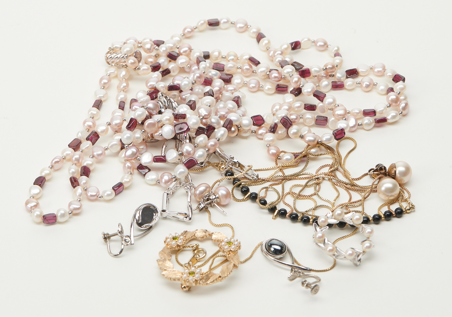 A COLLECTION OF JEWELLERY INCLUDING CULTURED PEARLS, CULTURED PEARL EARRINGS, BROOCHES AND A HEMATITE SUITE