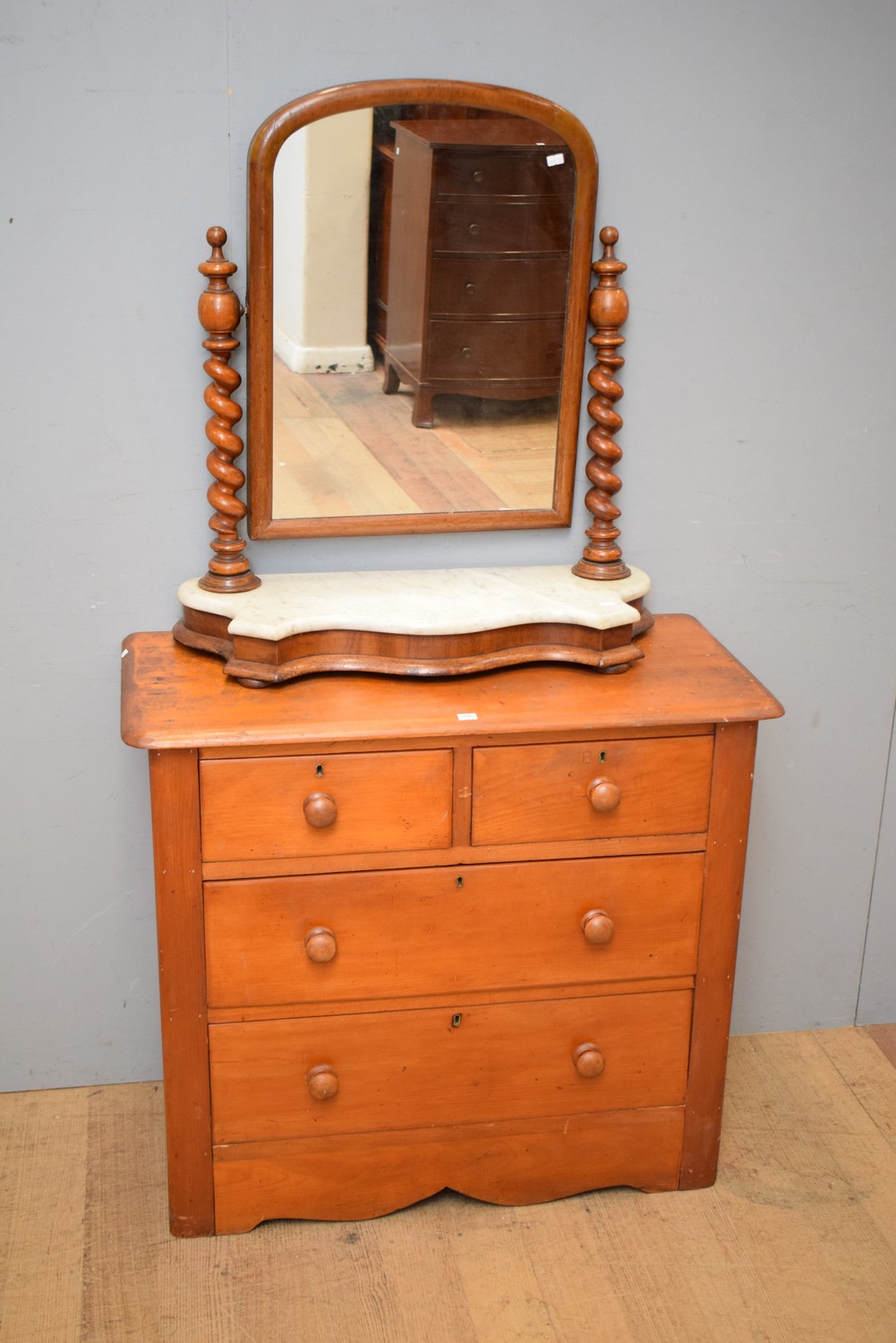 AN ANTIQUE CHEST OF DRAWERS WITH MARBLE AND BARLEY TWIST DRESSING TABLE MIRROR (A/F) (CHEST 82H x 92W x 43D CM) (MIRROR 83H x 72W x 26D CM) (LEONARD JOEL DELIVERY SIZE: LARGE)