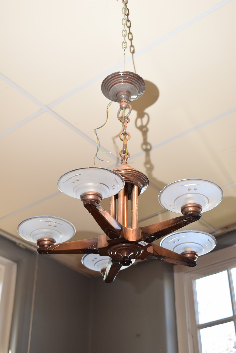 A FRENCH ART DECO LIGHT WITH BLUE GLASS SHADES, C 1930 (70H x 60W CM) (LEONARD JOEL DELIVERY SIZE: LARGE)