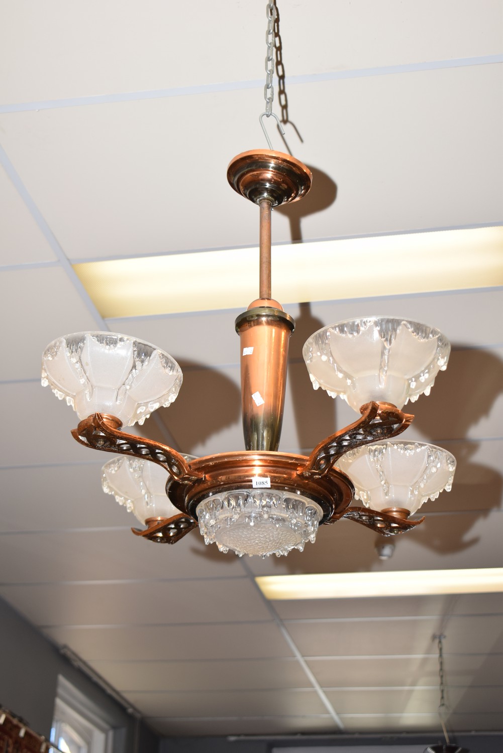 A FRENCH ART DECO COPPER AND GLASS LIGHT BY EZAN, C 1935 (72H x 75W CM) (LEONARD JOEL DELIVERY SIZE: LARGE)