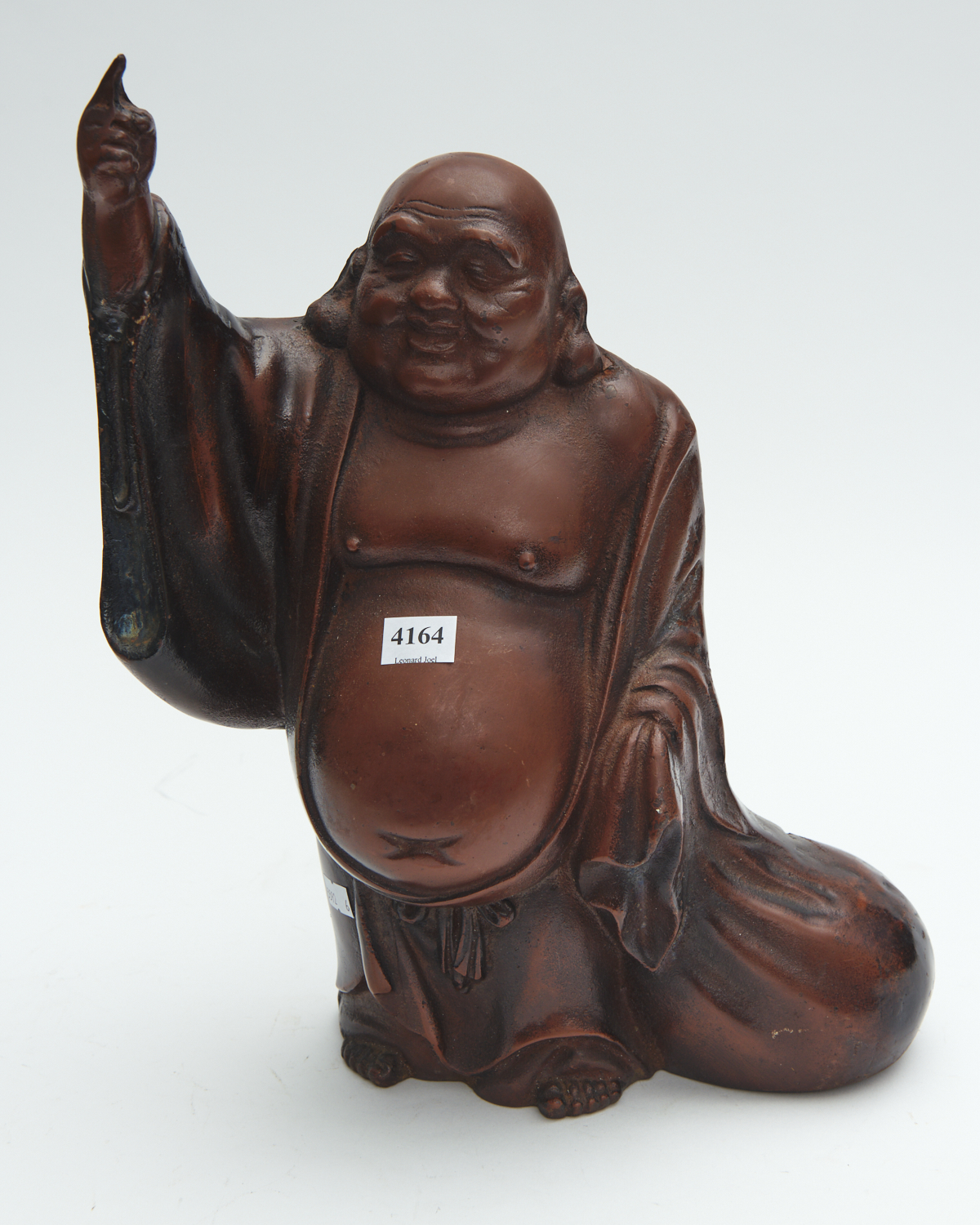 A LARGE BRONZED STEEL HAPPY BUDDHA FIGURE WITH POINTED FINGER, 38 CM HIGH, LEONARD JOEL LOCAL DELIVERY SIZE: SMALL