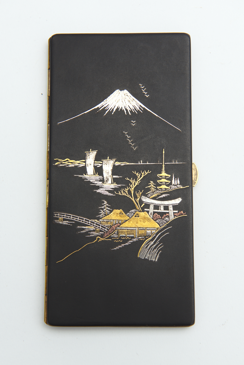 A CIGARETTE CASE INLAID WITH STERLING SILVER AND GOLD 17 X 8CM, LEONARD JOEL DELIVERY SIZE: SMALL