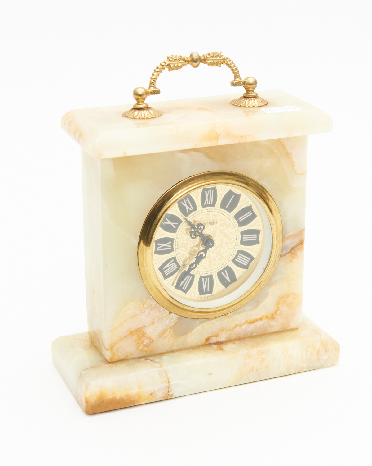 AN ONYX CASED MANTEL CLOCK HOUSING A MERCEDES MOVEMENT, 20 CM HIGH, LEONARD JOEL DELIVERY SIZE: SMALL