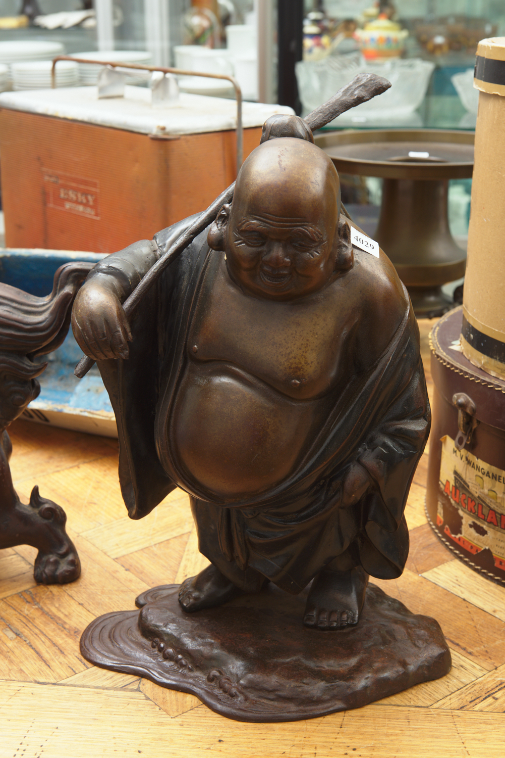 A PATINATED IRON BUDDHA FIGURE WITH STICK ACROSS SHOULDER, H.44CM, LEONARD JOEL LOCAL DELIVERY SIZE: SMALL