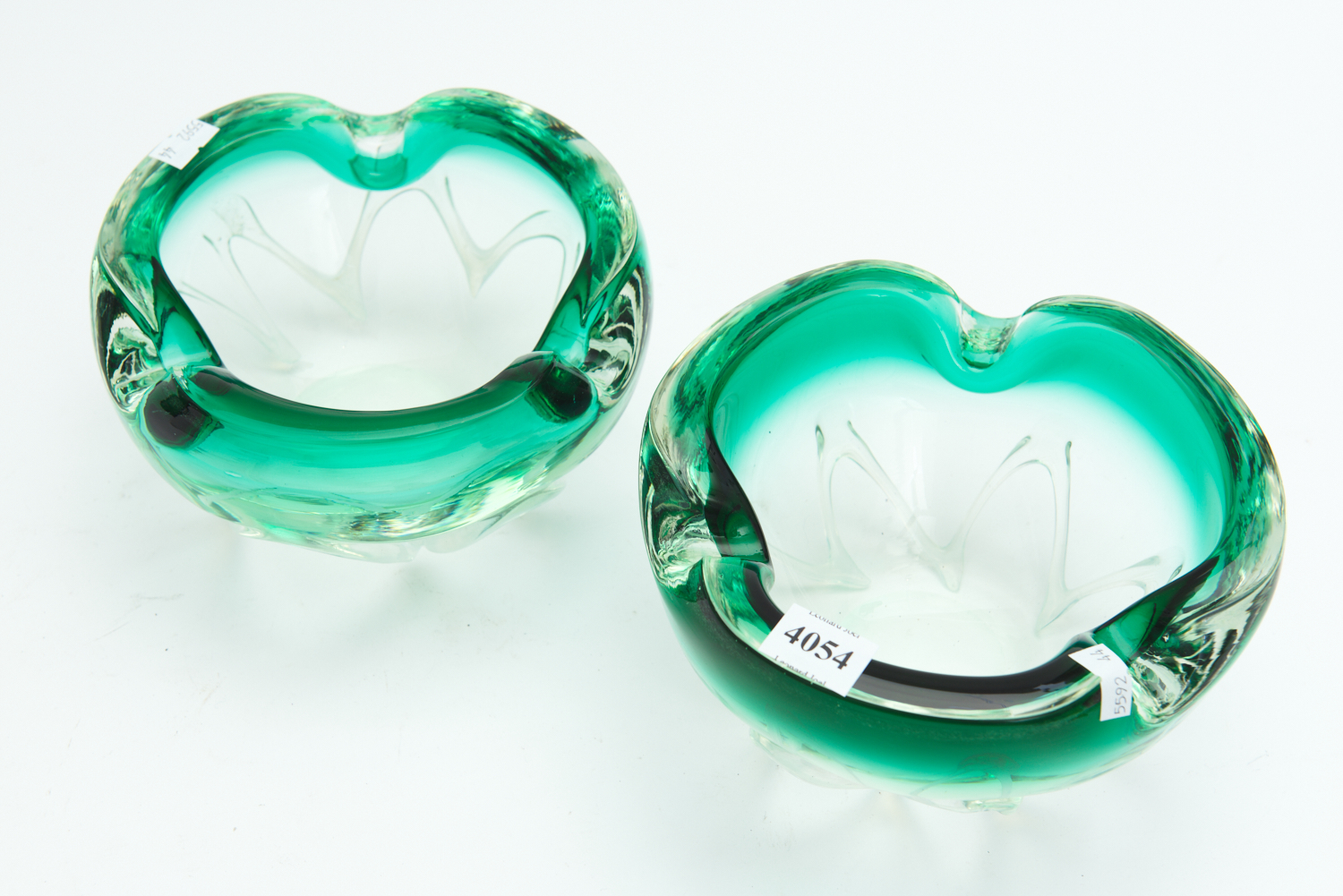 A PAIR OF GREEN ORGANIC FORM BOWLS WITH WHITE TRAILING TO SIDES DIA.18CM EA, LEONARD JOEL LOCAL DELIVERY SIZE: SMALL