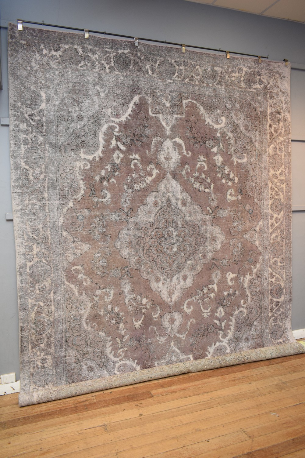 A MODERN VINTAGE OVER-DYED PERSIAN TABRIZ CARPET. EX-GALLERY EXHIBITED. CREATED FROM A FINELY HAND-KNOTTED VINTAGE MEDALLION DESIGN PERSIAN TABRIZ CARPET, KNOTTED USING HAND SPUN WOOL ON STRONG COTTON WARPS WITH THE PILE SHORN DOWN. THE ENTIRE IS DYED IN SUBTLE CREAM, SAND-TONED & CHARCOAL DYES. AS SEEN IN VOGUE & HOME DÉCOR MAGAZINES. CERTIFICATE OF AUTHENTICITY INCLUDED. SIZE: 378X300CM, ORIGIN: PERSIA – RRP: $7,900 (LEONARD JOEL DELIVERY SIZE: LARGE)