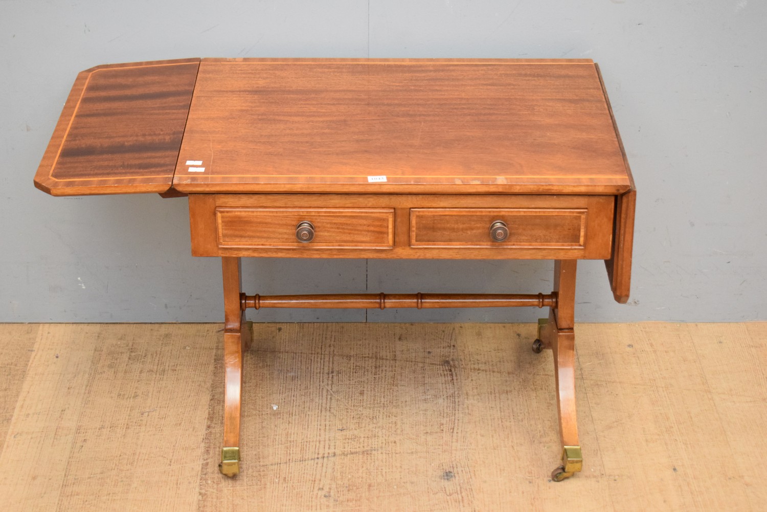 A REGENCY STYLE TWO DRAWER DROPSIDE COFFEE TABLE (A/F DAMAGE TO VENEER) (54H x 105W x 46D CM) (LEONARD JOEL DELIVERY SIZE: MEDIUM)