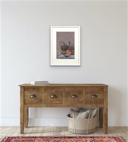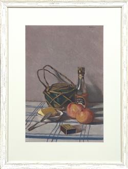 Still Life with Butter and Apples c.1930 is similarly limited in colour palette, with greys, purples and reds favoured by Badham. The knife, too, is resting near the clean cut butter waiting to be spread. These rather simple objects are given great importance within the composition, perhaps indicative of the value of such products after the war. Both paintings portray a domestic tranquility where objects typically seen as mundane create a stylised portrayal of Badham's everyday life.