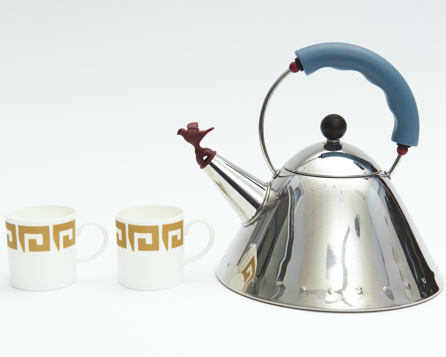 AN ALESSI KETTLE DESIGNED BY MICHAEL GRAVES (ITALY) WITH TWO SUSIE COOPER WEDGWOOD CUPS (UK), LEONARD JOEL DELIVERY SIZE: SMALL