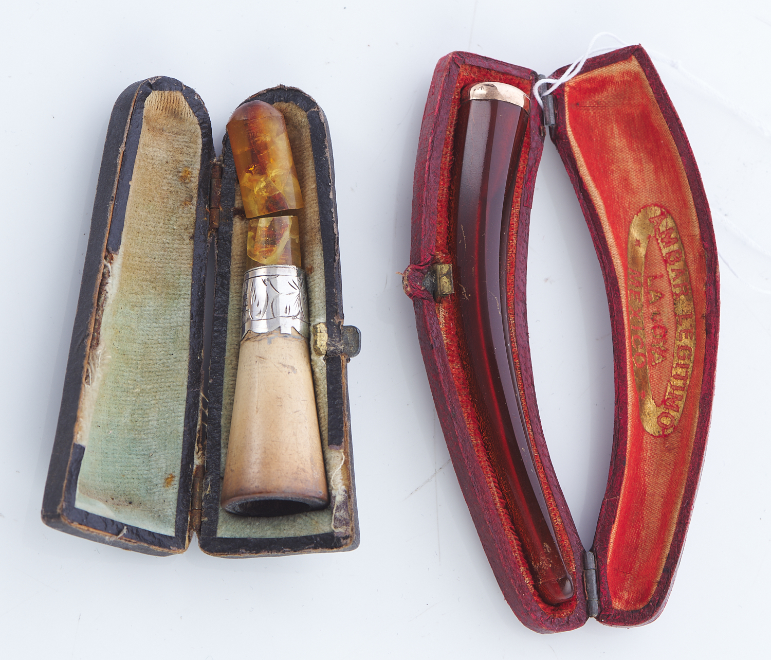 TWO ANTIQUE CIGARETTE HOLDERS IN AMBER, ONE SET WITH A GOLD RIM AND THE OTHER ONE WITH STERLING SILVER DETAILS, HALLMARKED CHESTER 1907 (A/F), BOXED, LENGTH 9CM AND 6.5CM
