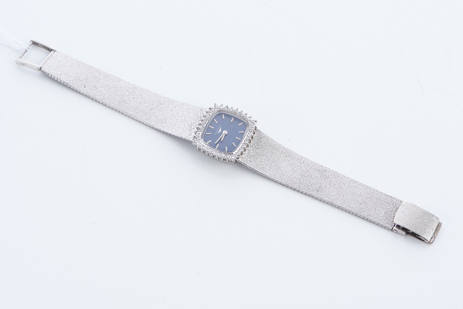 A VINTAGE LONGINES MANUAL WIND WRISTWATCH WITH NAVY DIAL AND DIAMOND SET BEZEL (THIRTY FOUR SINGLE CUT DIAMONDS), TO STAINLESS STEEL CASE AND BANDS, TOTAL LENGTH 180MM