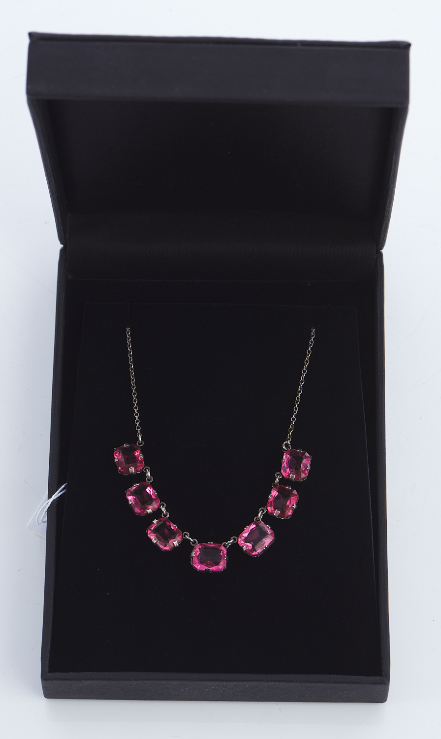 A VINTAGE PINK PASTE SET NECKLACE TO A FINE TRACE LINK CHAIN AND BARREL CLASP IN SILVER , TOTAL LENGTH 420MM