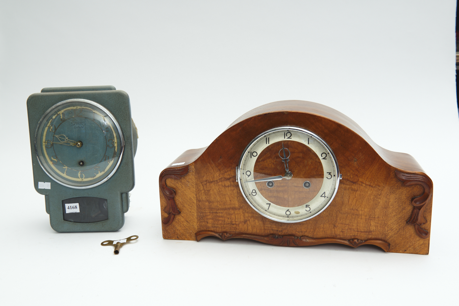 TWO VINTAGE CLOCKS, INCLUDING A SMITHS ENFIELD WALL CLOCK AND A MANTEL CLOCK, THE SMITHS CLOCK 26 CM HIGH, THE MANTEL CLOCK 43 CM WIDE, LEONARD JOEL DELIVERY SIZE: MEDIUM