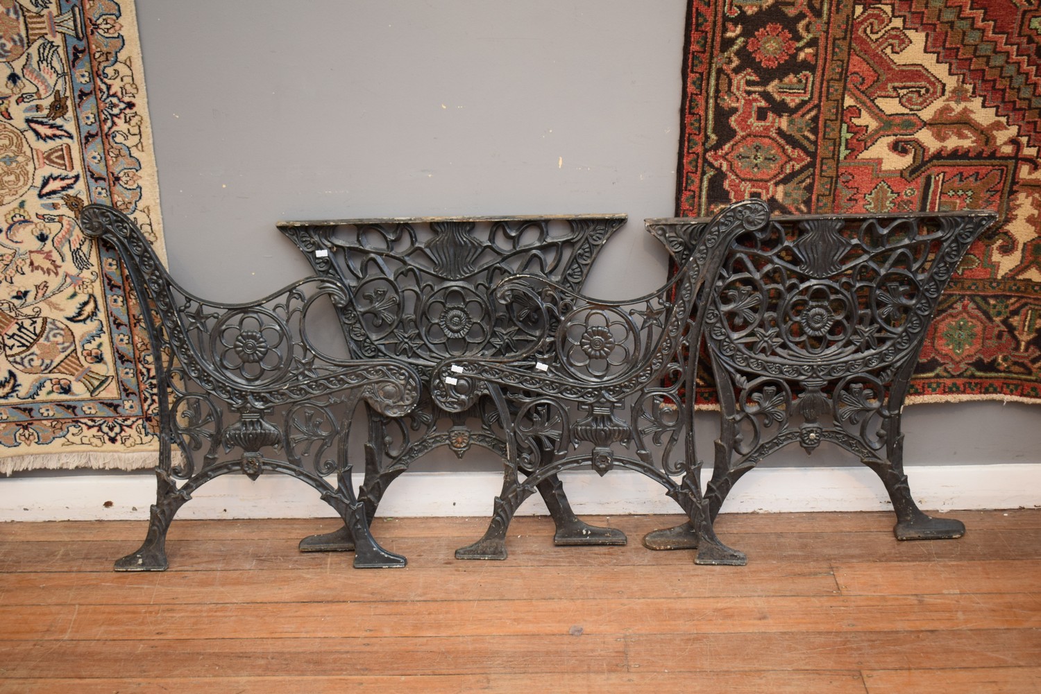 A COLLECTION OF MATCHING CAST IRON BENCH AND TABLE ENDS (TABLE LEG 69H x 68W CM) (BENCH END 75H x 65W CM) (LEONARD JOEL DELIVERY SIZE: LARGE)