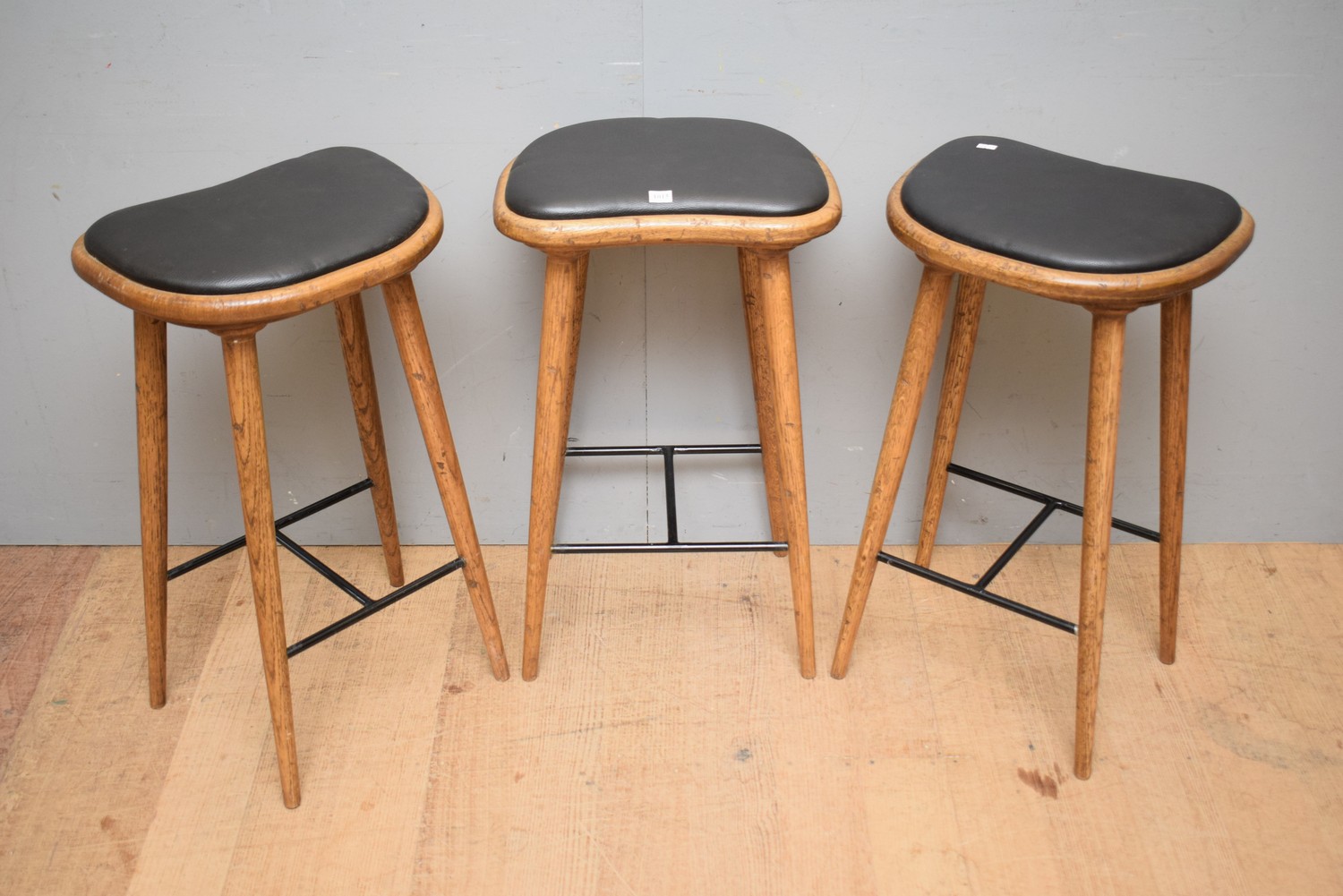 A SET OF THREE MID-CENTURY STYLE OAK BARSTOOLS WITH LEATHER SEATS (69H x 40W x 30D CM) ( LEONARD JOEL DELIVERY SIZE: MEDIUM)