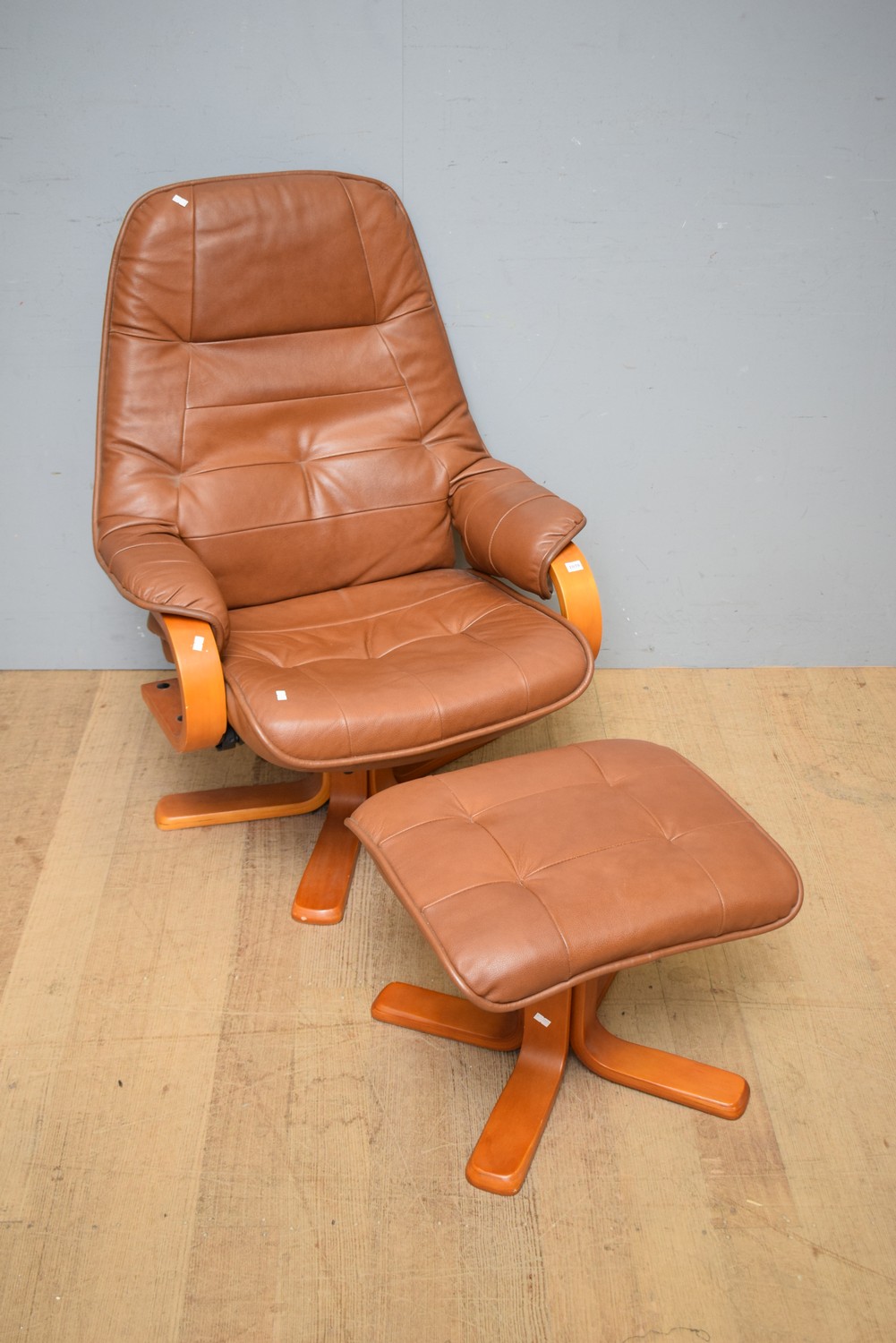A NORWEGIAN RECLINER AND FOOTSTOOL IN FAUX LEATHER (98H x 76W x 85D CM) (LEONARD JOEL DELIVERY SIZE: LARGE)