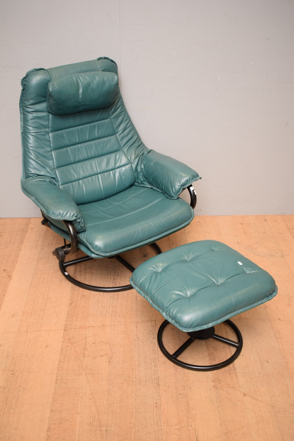 A GREEN LEATHER RECLINER AND FOOTSTOOL (A/F) (100H x 83W x 82D CM) (LEONARD JOEL DELIVERY SIZE: LARGE)