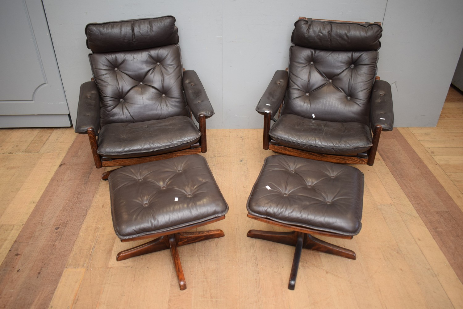 A PAIR OF MOBLER MID-CENTURY ARMCHAIRS WITH OTTOMANS (A/F) (89H x 80W x 87D CM) (LEONARD JOEL DELIVERY SIZE: LARGE)