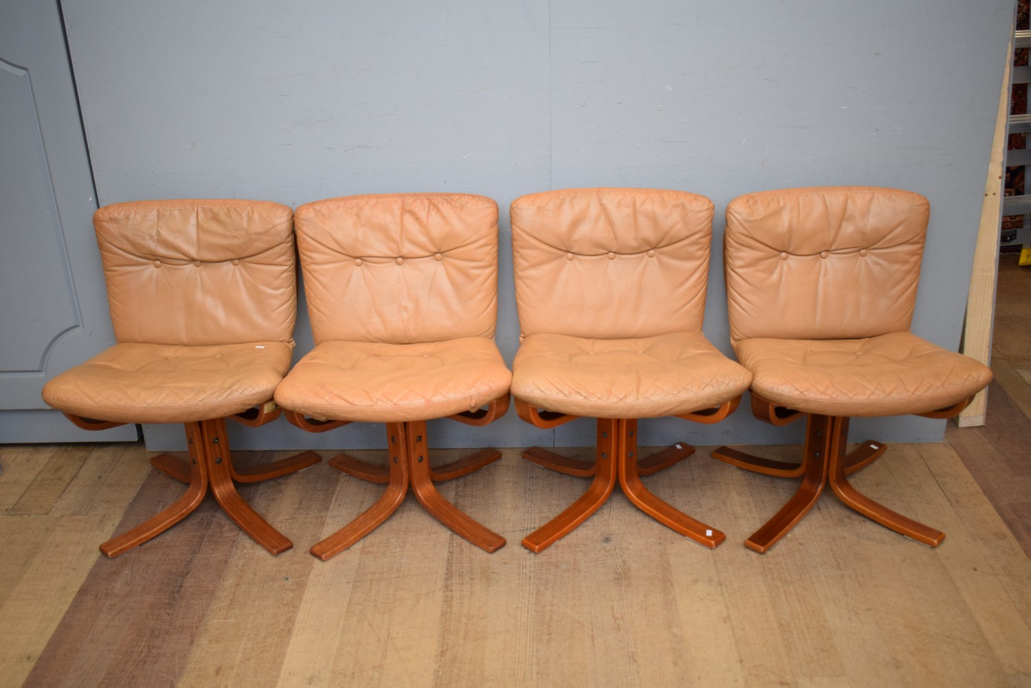 A SET OF FOUR MID-CENTURY LEATHER CHAIRS (A/F) (78H x 57W x 56D CM) (LEONARD JOEL DELIVERY SIZE: LARGE)