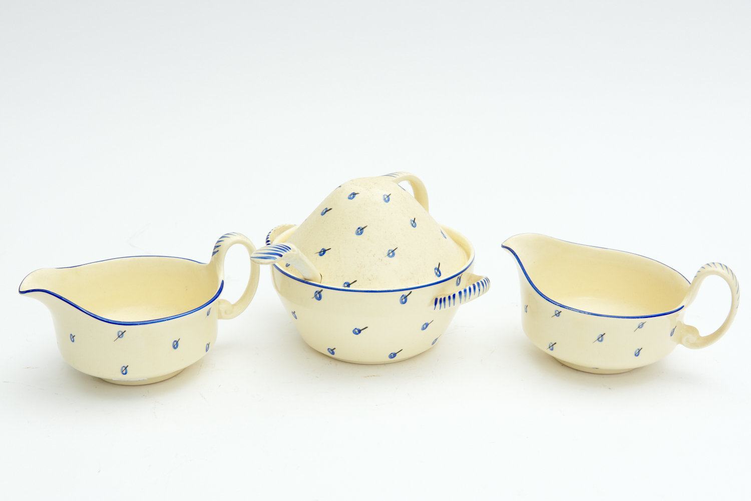 A MATCHING SUSIE COOPER GRAVY BOAT AND TWO JUGS, THE GRAVY BOAT 12 CM HIGH, LEONARD JOEL DELIVERY SIZE: SMALL