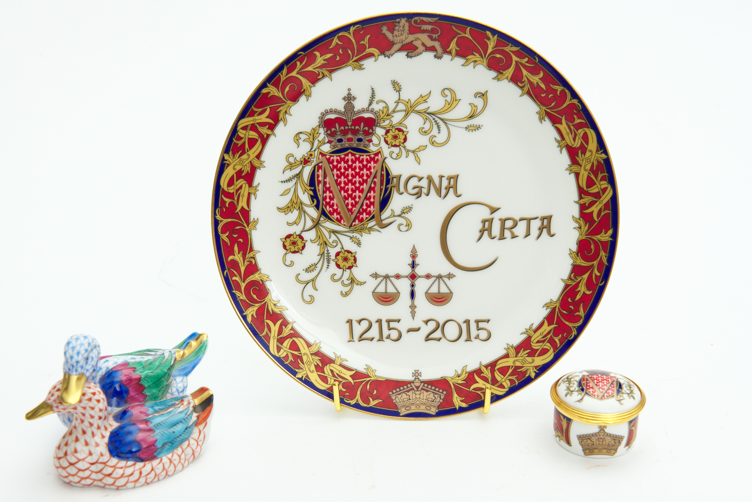 A WILLIAM EDWARDS 'MAGNA CARTA' PLATE WITH STAND AND ENAMELLED BOX, TOGETHER WITH A HEREND SWANS FIGURE GROUP, LEONARD JOEL DELIVERY SIZE: SMALL