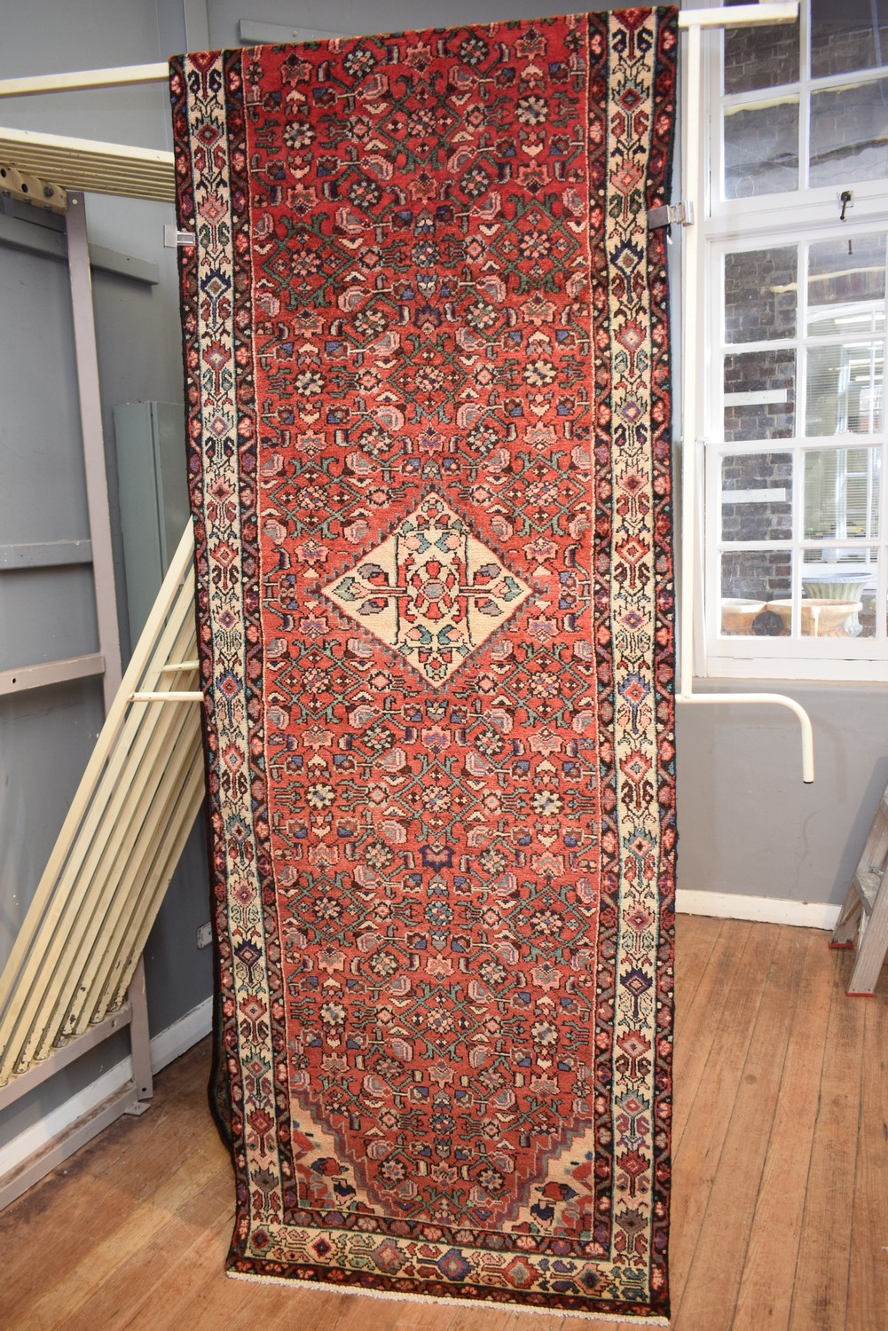 A PERSIAN HOSSAINABAD HALL RUNNER. 100% WOOL. SOLID & DENSE PILE. HAND-KNOTTED VILLAGE WEAVE FROM THE HAMADAN REGION WITH TRIBAL DESIGN OF DIAMOND-SHAPED MEDALLION & CORNER MEDALLIONS IN A RED FIELD OF ALL-OVER BOLD HERATI MAHI PATTERNS. SOLID & HARD-WEARING. GALLERY INVENTORY. IN EXCELLENT CONDITION. CERTIFICATE OF AUTHENTICITY INCLUDED. SIZE: 300X97CM