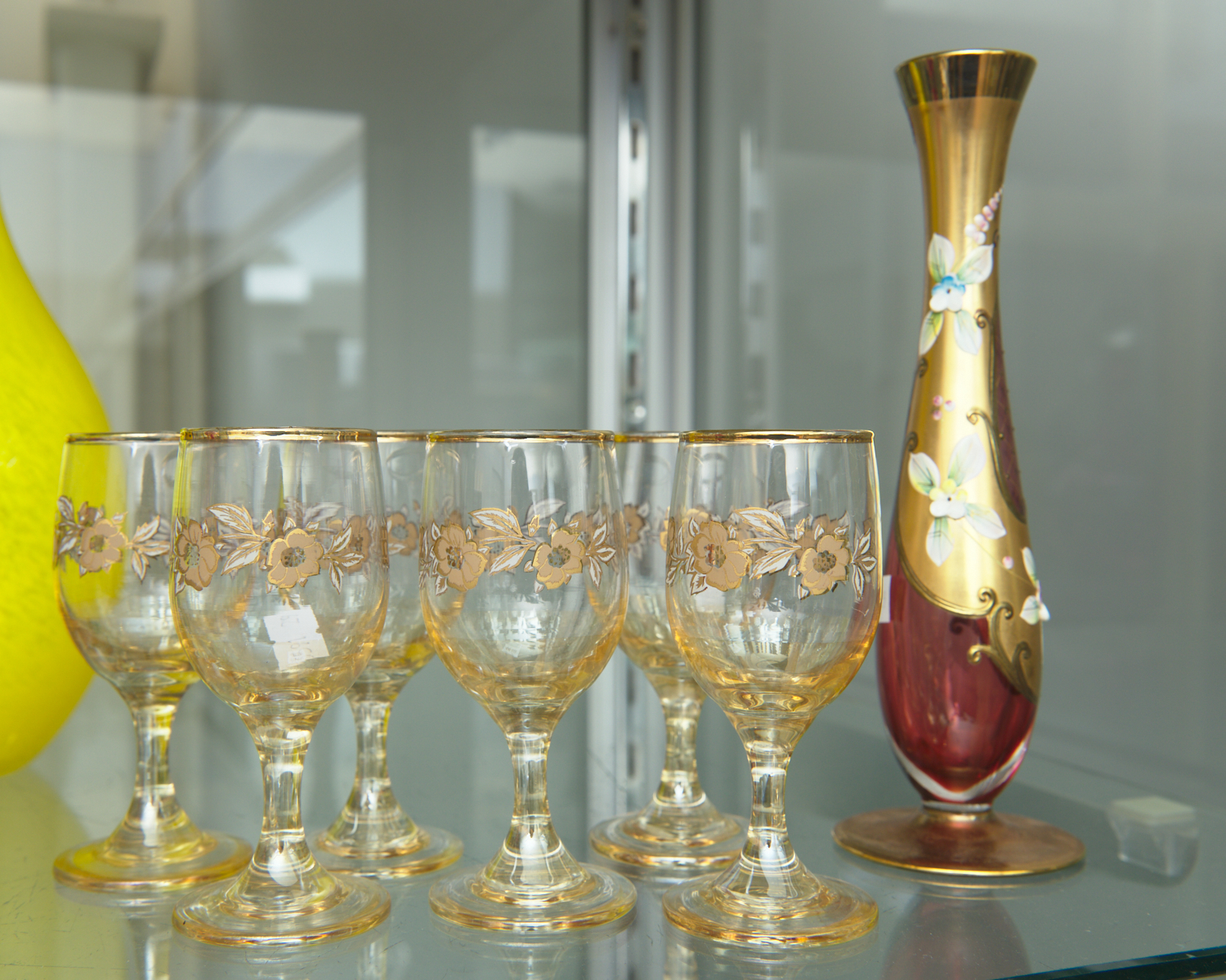 A GILT AND ENAMELLED VENETIAN GLASS STEM VASE H.20CM AND SIX GILDED GLASS LIQUEUR GLASSES LEONARD JOEL DELIVERY SIZE: SMALL