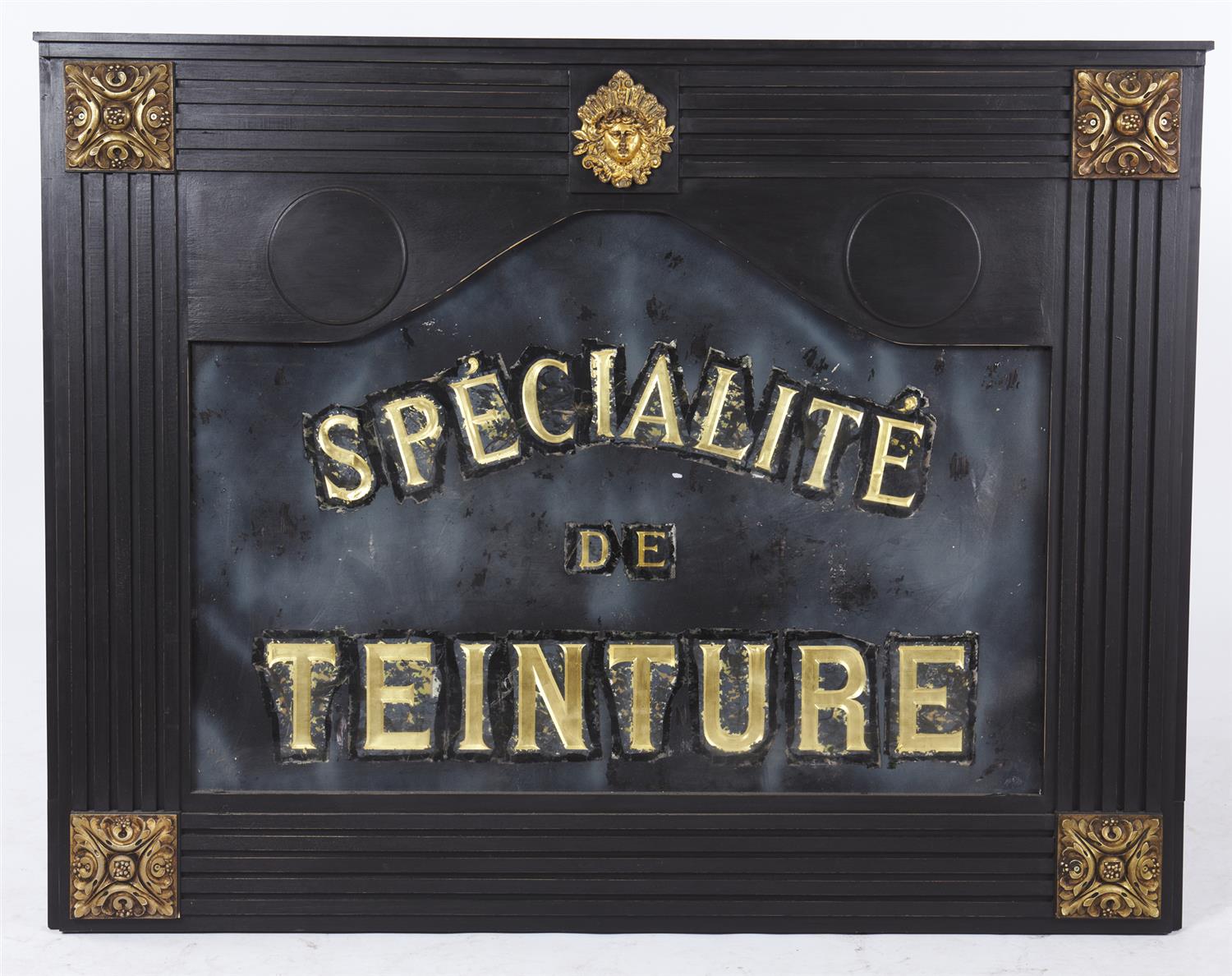 'SPECIALITE DE TEINTURE', translating in English to 'Dye Speciality', gilded lettering applied to the reverse of the glass and housed in a later ebonised wooden frame applied with decorative gilded mouldings
