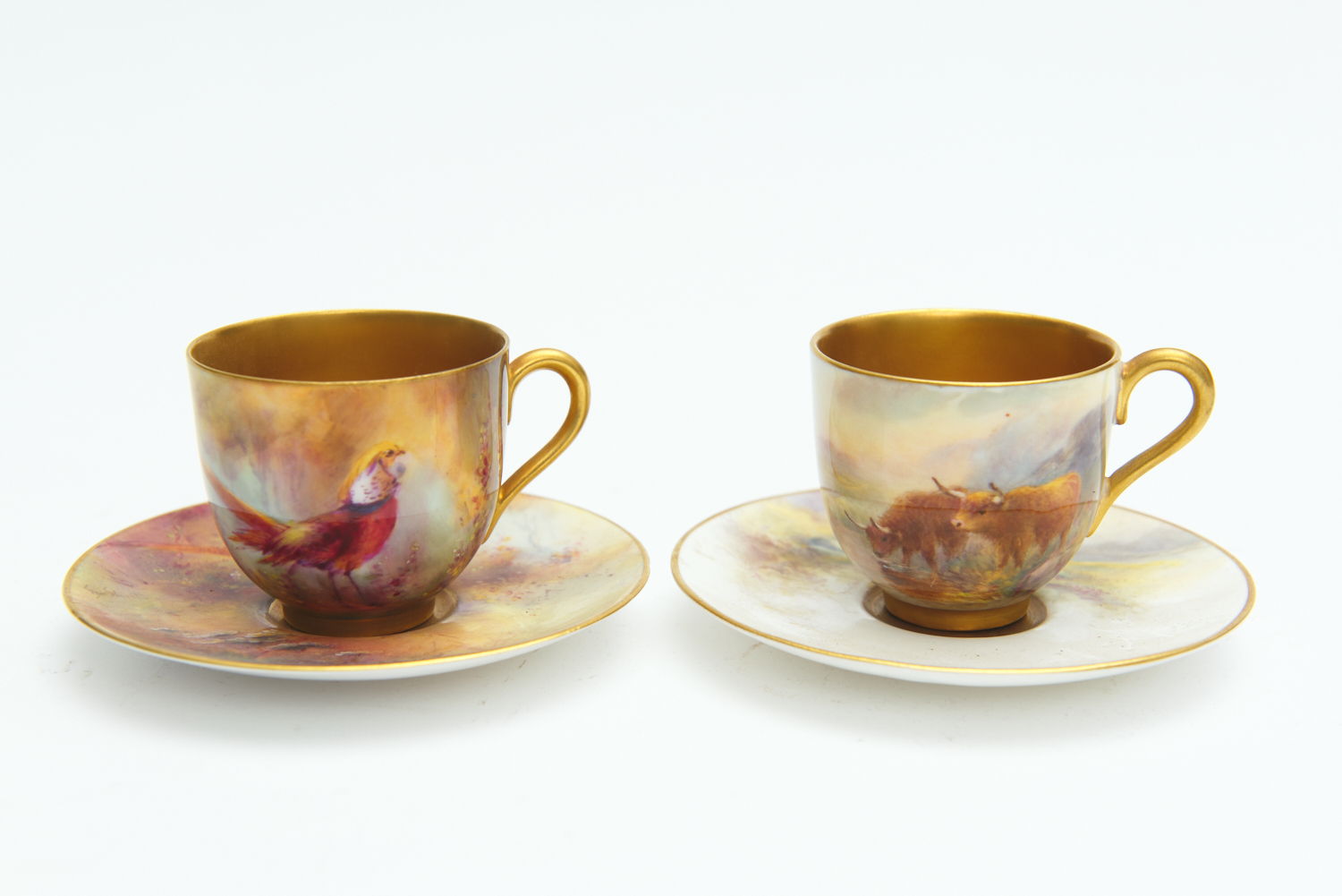 BOTH CUPS AND SAUCERS IN GOOD ORDER, EACH PIECE RINGS SOUND, SURFACE DUST, THE GILDING TO THE CENTRE OF EACH SAUCER SHOWS WEAR CONSISTENT WITH AGE, EACH PIECE CLEARLY SIGNED, NO CHIPS, CRACKS OR RESTORATION