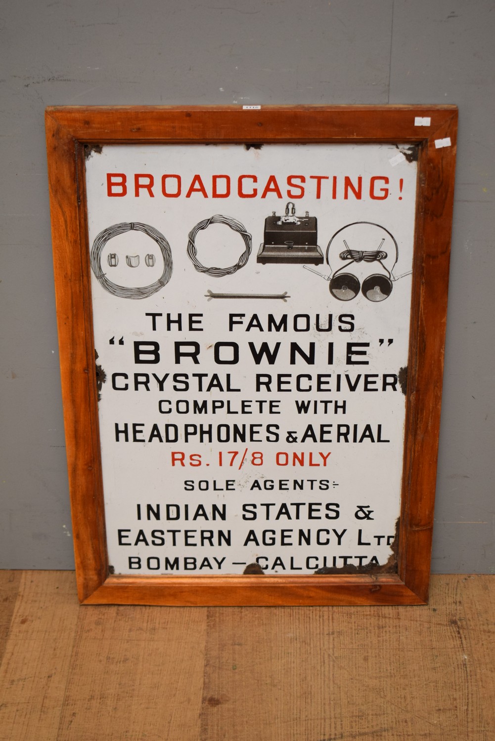 A 1900S WOODEN FRAMED BROADCASTING THE FAMOUS 'BROWNIE' CRYSTAL RECEIVED ENAMEL SIGN (85H x 59W) (DELIVERY SIZE: MEDIUM)