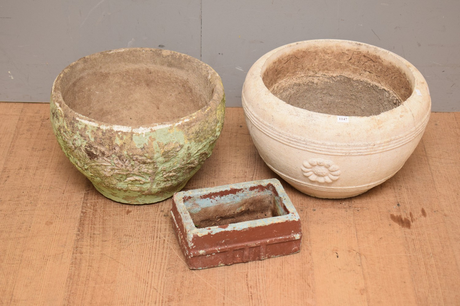 A COLLECTION OF THREE 1940S AUSTRALIAN CONCRETE GARDEN POTS, TWO WITH FLORAL MOTIFS AND ONE RECTANGULAR BRICK FORM (A/F) (29H x 45D CM) (PLEASE NOTE THIS HEAVY ITEM MUST BE REMOVED BY CARRIERS AT THE CUSTOMER'S EXPENSE. LEONARD JOEL STAFF CANNOT ASSIST CARRYING THIS ITEM) (DELIVERY SIZE: LARGE)