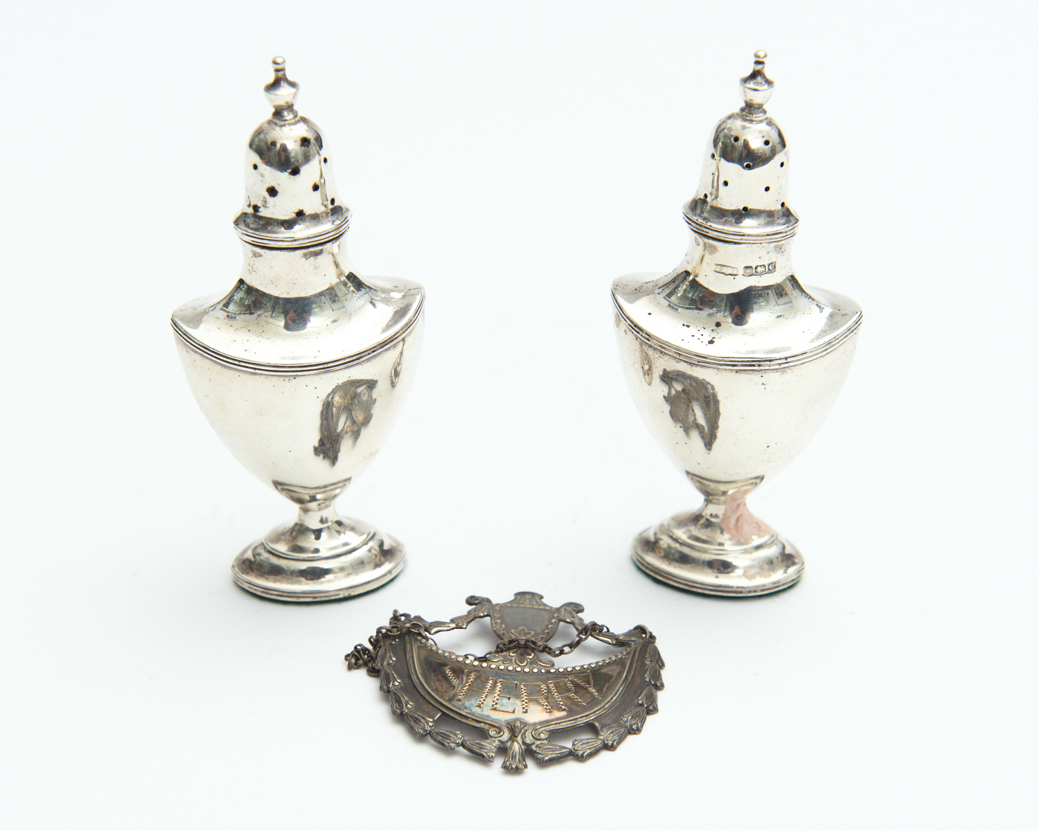 A PAIR OF STERLING SILVER PEPPER SHAKERS WITH WEIGHTED BASES, JAMES DIXON AND SONS TOGETHER WITH STERLING SILVER SHERRY DECANTER LABEL, LEONARD JOEL DELIVERY SIZE: SMALL