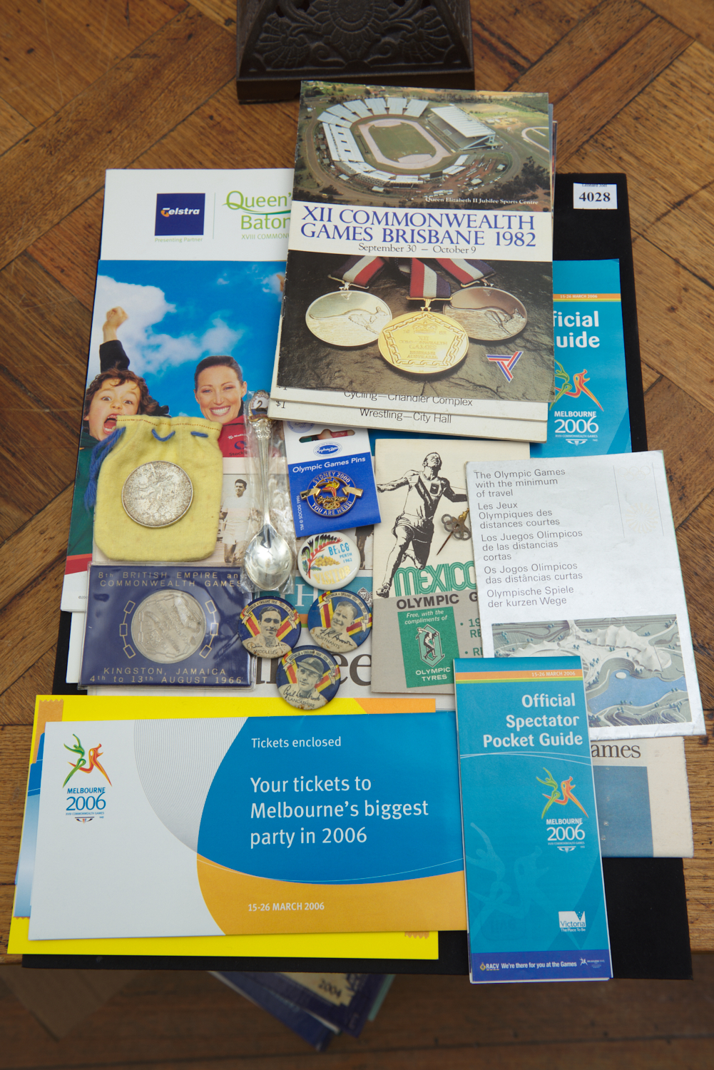 A COLLECTION OF MEMORABILIA RELATING TO THE OLYMPIC AND COMMONWEALTH GAMES, INCLUDING A 1962 PERTH EMPIRE GAMES COMMEMORATIVE SPOON AND VISITOR'S BADGE; A 1966 JAMAICA COMMONWEALTH GAMES MEDALLION; 1982 BRISBANE COMMONWEALTH GAMES BOOKLETS AND PROGRAMS; MEXICO 1968 OLYMPIC GAMES RESULTS AND RECORDS BOOKLET AND COMMEMORATIVE MEDALLION; MELBOURNE 2006 COMMONWEALTH GAMES EPHEMERA; AND A SYDNEY 200 OLYMPICS PIN; TOGETHER WITH AUSTRALIA V ENGLAND 1950-51 TEST TOUR CRICKET BADGES, DEPICTING PLAYERS FOR MIDDLESEX, LANCASHIRE AND NORTHANTS, LEONARD JOEL DELIVERY SIZE: SMALL
