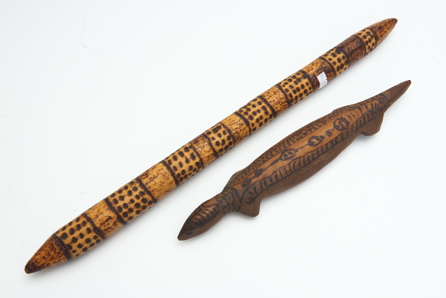 AN ABORIGINAL WESTERN DESERT DIGGING STICK L.57CM AND A CARVED WOODEN GOANNA L.37CM, LEONARD JOEL DELIVERY SIZE: SMALL