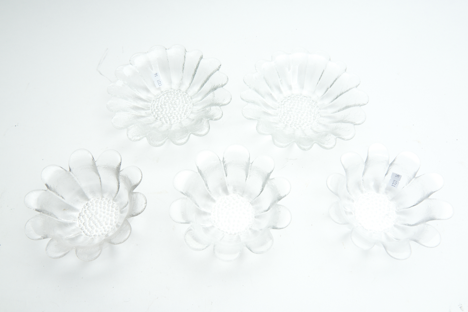 FIVE DARTINGTON CRYSTAL DAISY DESSERT BOWLS BY FRANK THROWER DIA. 15CM AND 18CM, LEONARD JOEL DELIVERY SIZE: SMALL