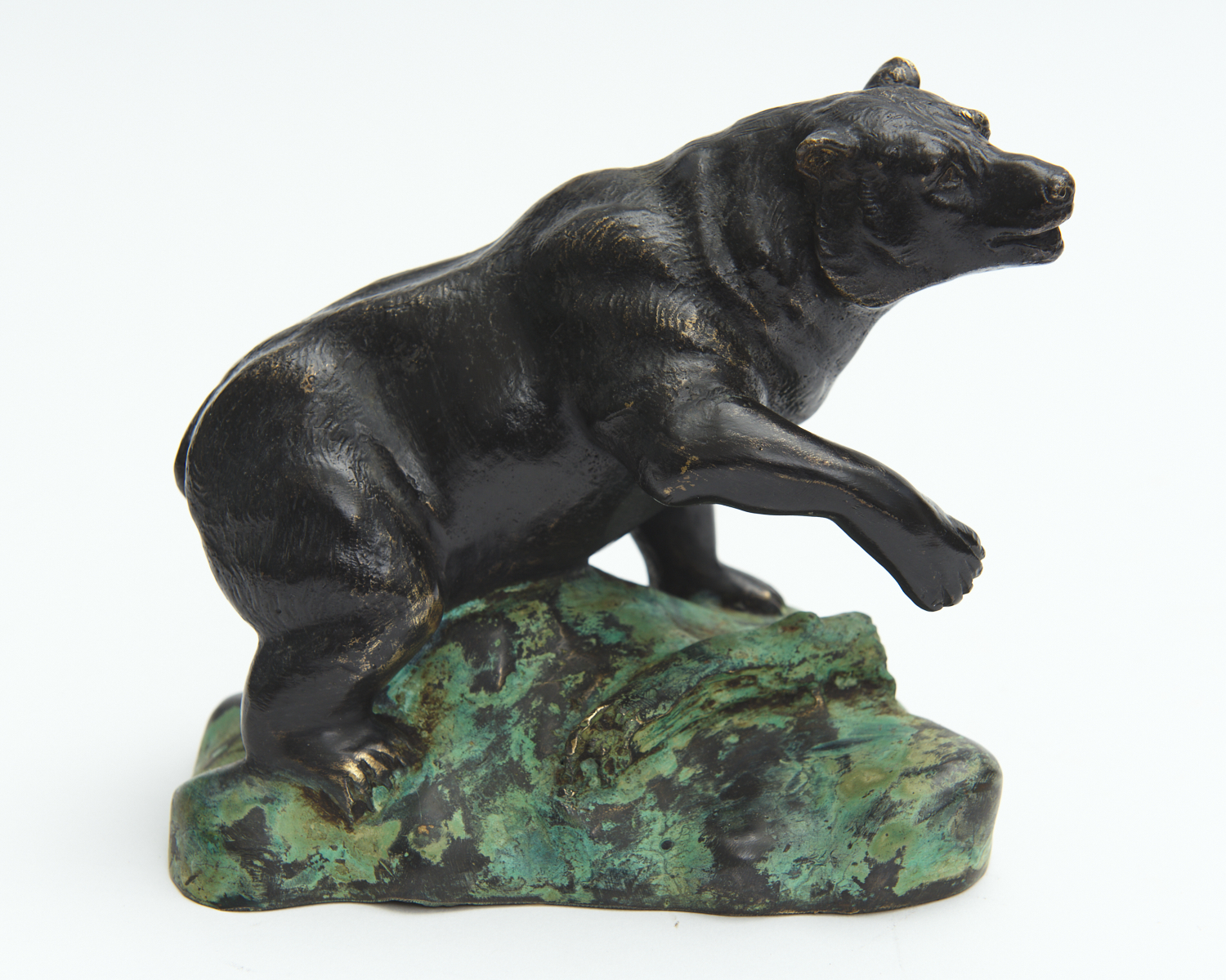 A BRONZE PATINATED FIGURE OF A BEAR ON A ROCKY OUTCROP, 16 CM HIGH, 18 CM WIDE, LEONARD JOEL DELIVERY SIZE: SMALL
