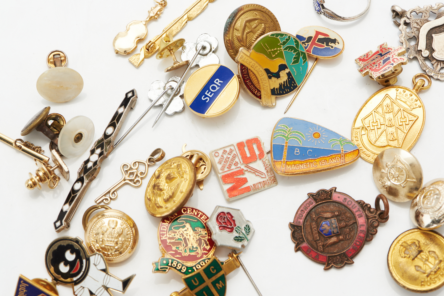 A WWII ROYAL AIR FORCE HISTORICAL ENAMELLED RING IN STERLING SILVER, SIZE N-O, TOGETHER WITH A COLLECTION OF VINTAGE BADGES