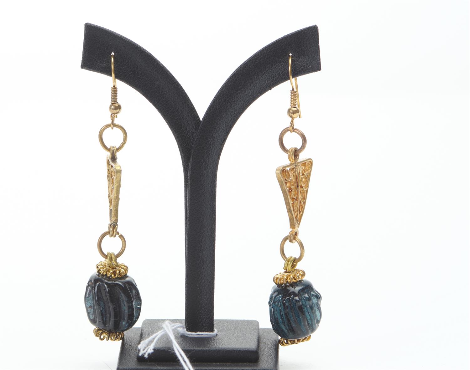 A PAIR OF EGYPTIAN DROP EARRINGS SET WITH GLASS BEAD, TO SHEPHERD HOOK FITTINGS, HANDCRAFTED IN GILT BRASS, TOTAL LENGTH 75MM