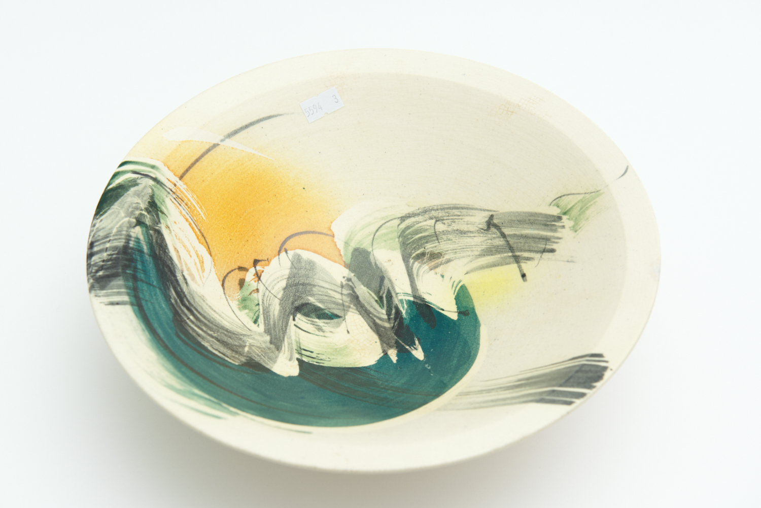 INSCRIBED SIGNATURE AND DATE 1986 TO THE UNDERSIDE; CHIP TO THE FOOT APPROXIMATELY 1 CM LONG; OVERALL CRAZING TO THE TOP AND TO THE UNDERSIDE; TWO SMALL AREAS OF SLIGHTLY DISCOLOURED CRAZING NEAR THE RIM OF THE TOP SIDE