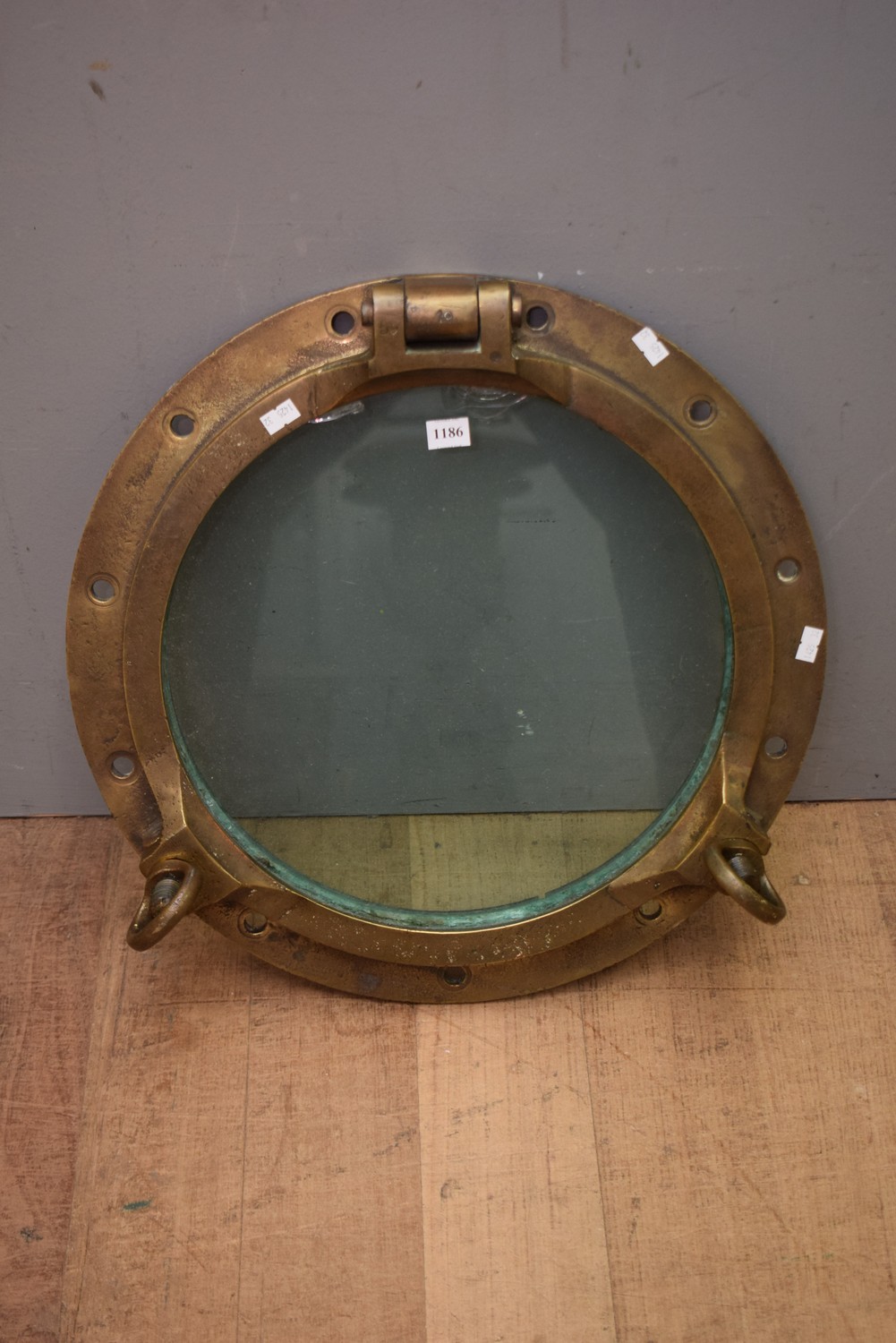 AN ANTIQUE BRASS PORT HOLE (A/F - CHIPS TO GLASS) (50D CM) (LEONARD JOEL DELIVERY SIZE: LARGE)