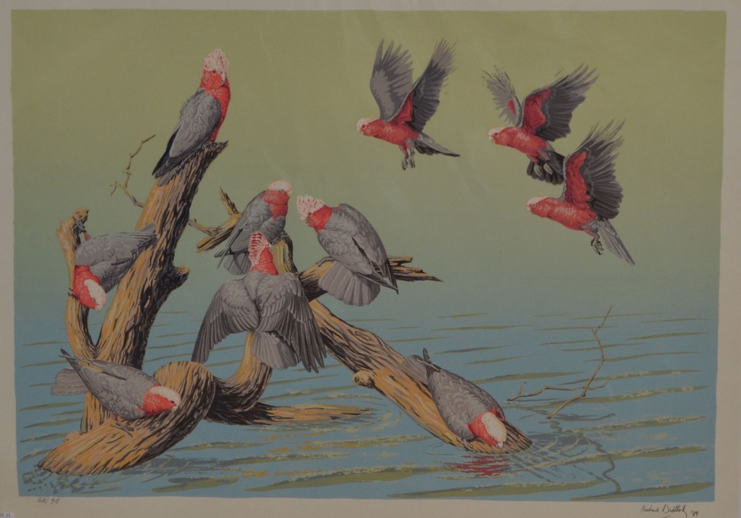 RICHARD WEATHERLY, PINK COCKATOOS 1989, SCREENPRINT 68/90, SHEET SIZE: 56 X 76CM, UNFRAMED BUT BACKED AND WRAPPED FOR PROTECTION, CONDITION: VERY GOOD.. LEONARD JOEL DELIVERY SIZE: SMALL