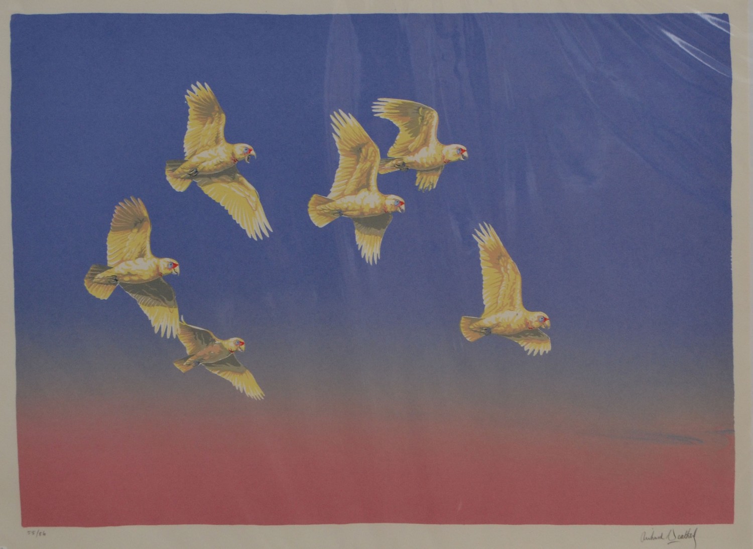 RICHARD WEATHERLY, BIRDS FLYING, SCREENPRINT 55/86, SHEET SIZE: 56 X 76CM, UNFRAMED BUT BACKED AND WRAPPED FOR PROTECTION, CONDITION: VERY GOOD.. LEONARD JOEL DELIVERY SIZE: SMALL