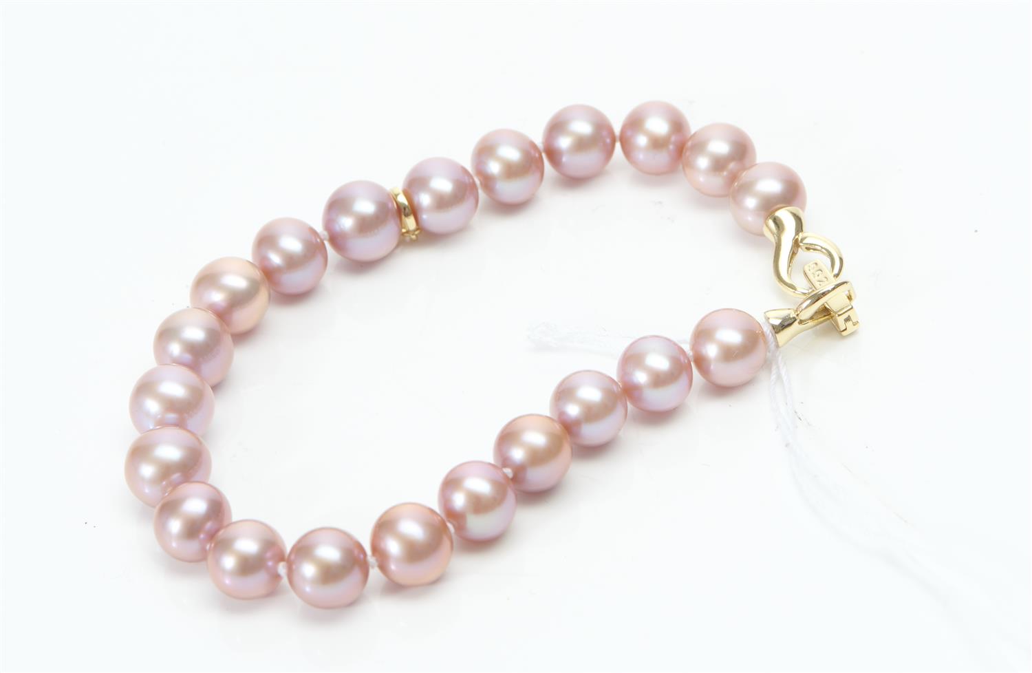 A PINK FRESHWATER PEARL BRACELET TO A SILVER GILT CLASP, TOTAL LENGTH 185MM.