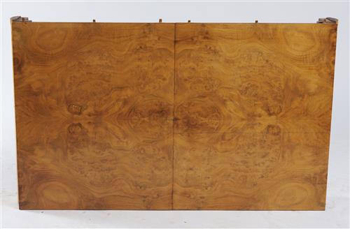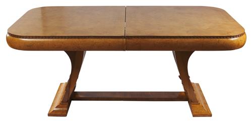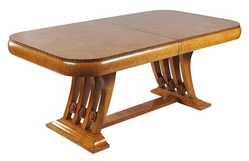 The curved rectangular top featuring bookmatched burr walnut veneer, the edge with a decorative carved foliate band, above an apron of conforming shape, raised upon two splayed pedestals decorated with roundels, terminating on moulded bases united with a stretcher, the table extending with one spare leaf