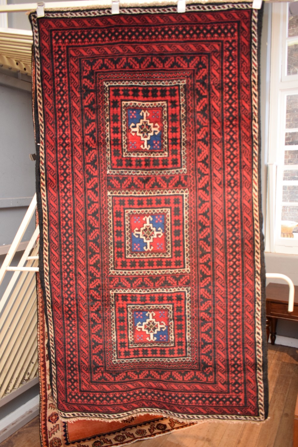 A TRIBAL PERSIAN BALOUCH RUG, 100% WOOL PILE. FINELY HAND-KNOTTED TRIBAL WEAVE FROM THE KHORASAN PROVINCE. TRIBAL DESIGN OF TRIPLE SQUARE-SHAPED MEDALLIONS CONTAINING AMULETS SET AGAINST A RIOT OF GEOMETRIC-PATTERNED MINOR BORDERS. GALLERY INVENTORY. IN EXCELLENT CONDITION. CERTIFICATE OF AUTHENTICITY INCLUDED. SIZE: 198X110CM, ORIGIN: PERSIA – RRP: $1,200 (LEONARD JOEL DELIVERY SIZE: LARGE)
