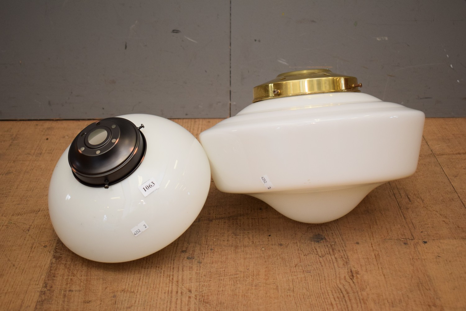 TWO MILK GLASS LIGHT SHADES WITH GALLERIES (LARGEST 30H x 36D CM) (LEONARD JOEL DELIVERY SIZE: SMALL)
