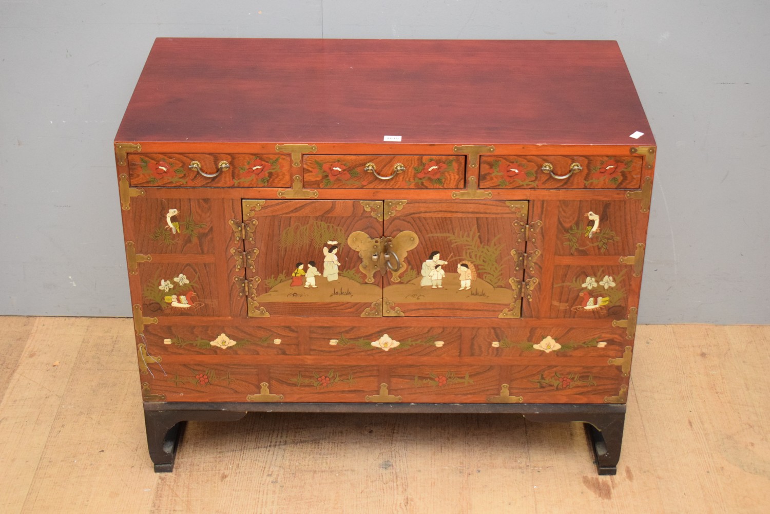 A 1950S CHINESE LACQUERED AND HAND PAINTED SIDE CABINET WITH THREE DRAWERS AND LOWER CUPBOARD ON STAND (63H x 81W x 41D CM) (LEONARD JOEL DELIVERY SIZE: LARGE)